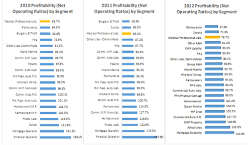 Note: The lower the percentage listed, the greater the profitability. Notice that the mortgage and financial guaranty segments remain the most unprofitable given the recent housing crisis leading to significant insurance claims.