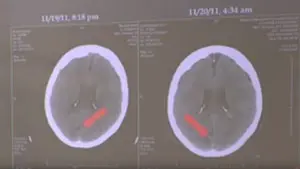 Serial CAT scans of the patient’s brain documented ischemic events occurring 12 hours earlier than the initial films, followed by reperfusion injury in those areas of the brain about 8 hours later. The ischemic events were most likely caused by embolisms (arterial plaques that ruptured and travelled to parts of the brain, blocking blood flow to it) that occurred around the same time within different areas of the brain fed by the basilar artery. This phenomenon, of multiple simultaneous ischemic events in different areas of the brain fed by the same arterial system, is not unusual and is seen on the studies as dark areas of dead tissue. Hours later, these damaged sites begin to slowly bleed as the blood is no longer contained within the infarcted structures. This is seen on the CAT scan as faded white areas within the dark infarctions.